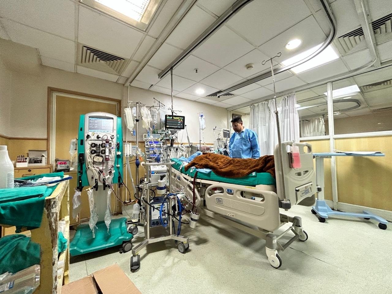 Each ICU bed is equipped with advanced monitoring systems, ventilators (including high-frequency oscillatory ventilators), nitric oxide delivery systems, CRRT and hemodialysis machines, ECMO and MARS systems, as well as bedside ultrasonography, echocardiography, and bronchoscopy.